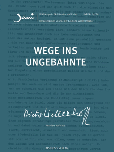 Sie finden auf dieser Website alle JUNI Hefte, die Sie bestellen können. Sie können Einzelbeiträge als pdf haben. Alle Besprechungen sind frei zugänglich und außerdem gibt’s noch ein paar Projekte und Texte, die den JUNI gesprengt hätten oder die raus sollen.